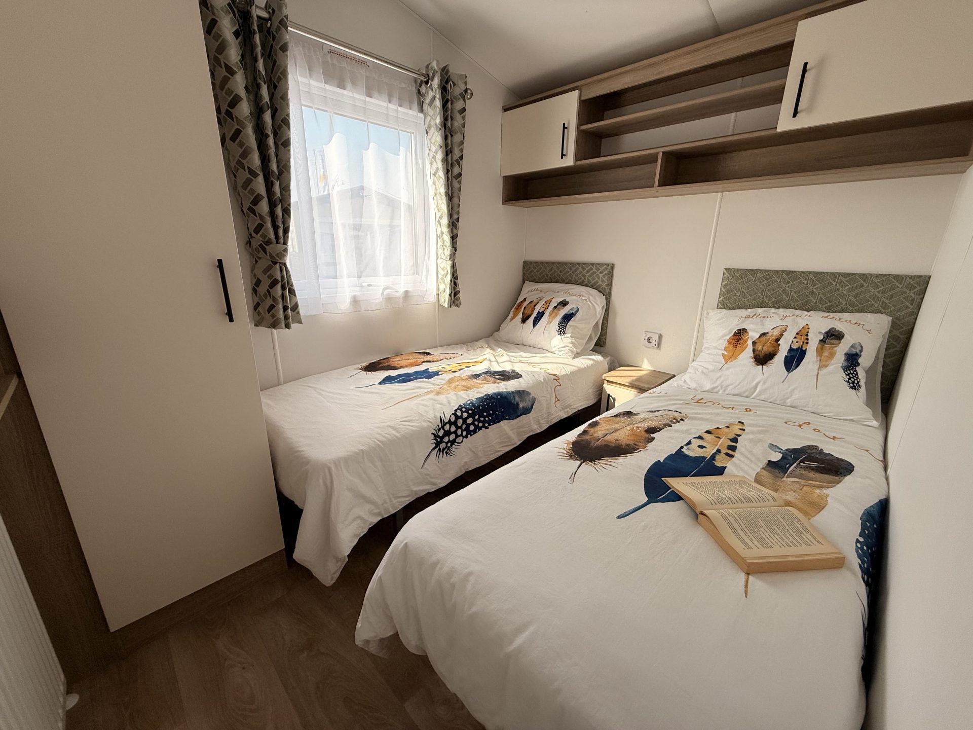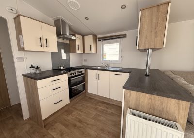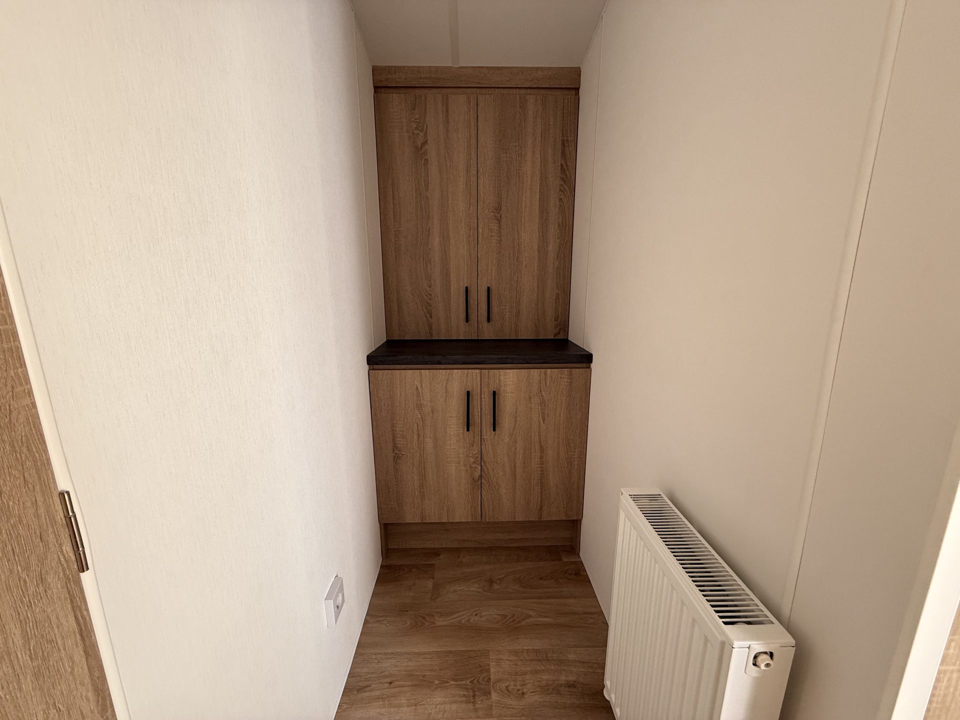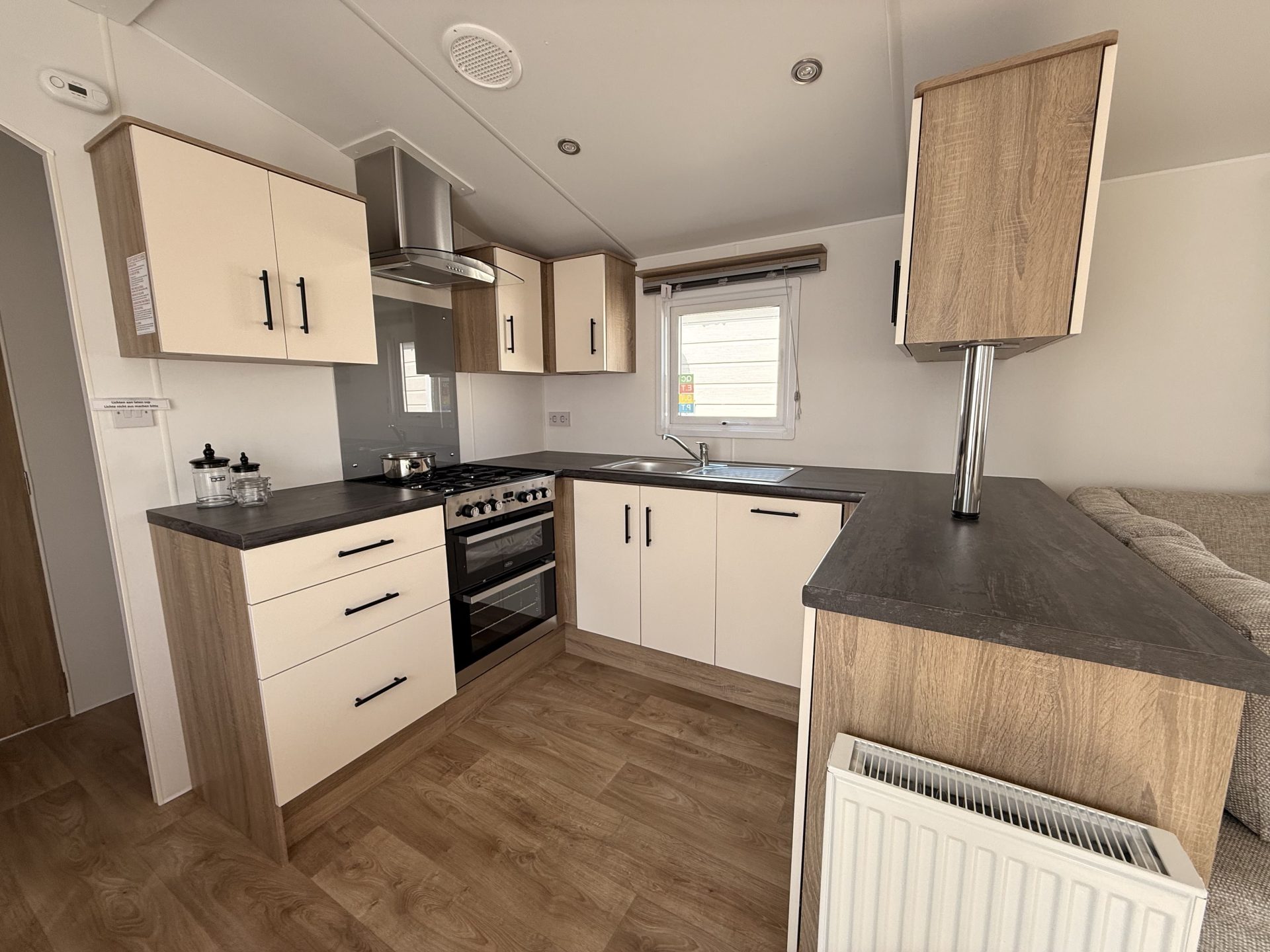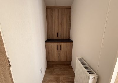 Op bovenstaande afbeeldingen wordt volgend model getoond: 1100 x 385 – 2 slaapkamers. Met toegepaste optie: vaatwasser.